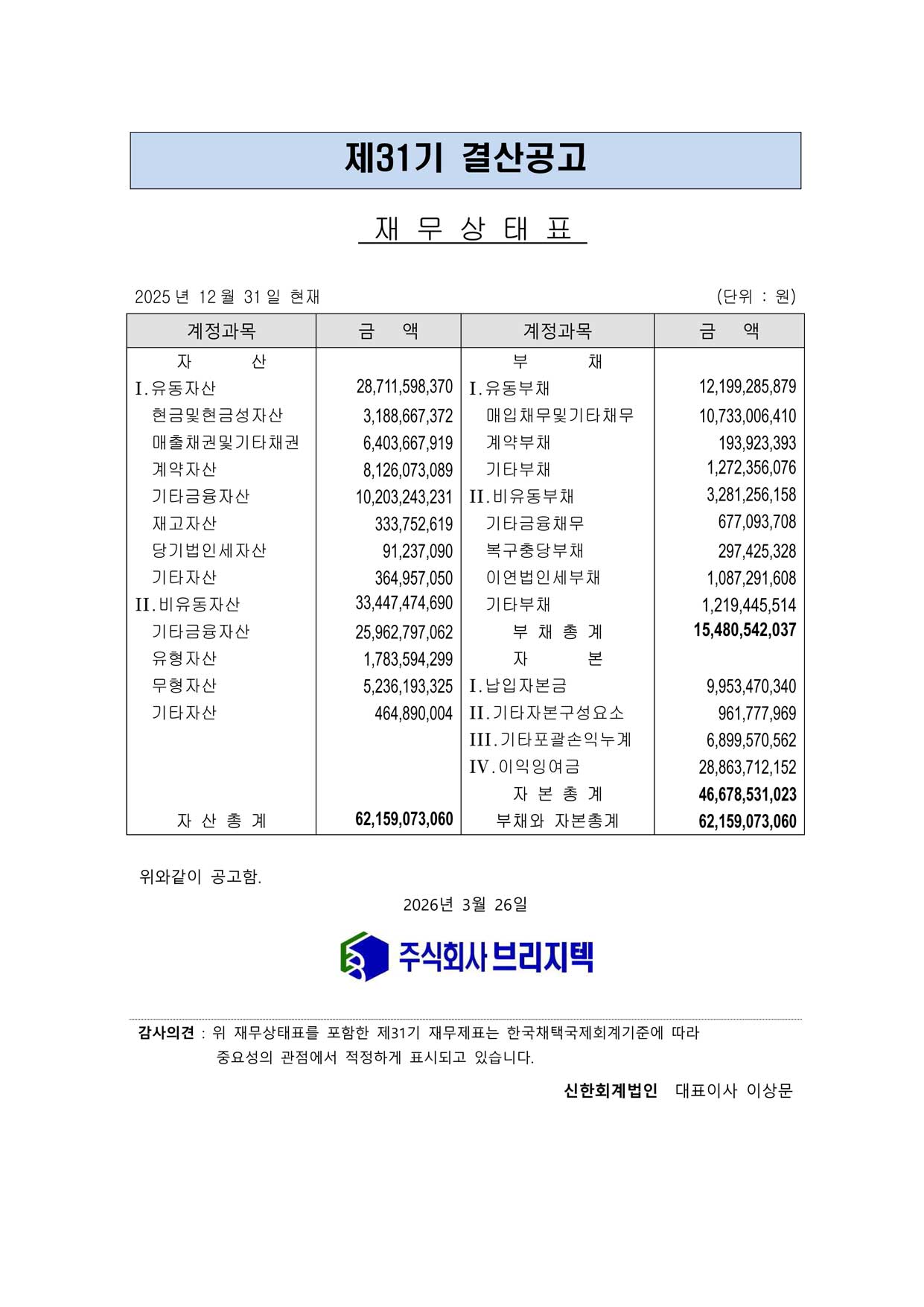 브리지텍 제31기 결산공고